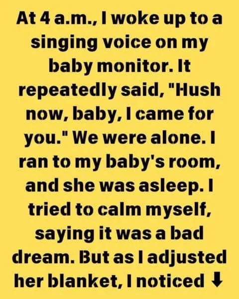 At 4 a.m., I woke up to a singing voice on my baby monitor. It repeatedly said, “Hush now, baby, I came for you.” We were alone. I ran to my baby’s room, and she was asleep. I tried to calm myself, saying it was a bad dream.