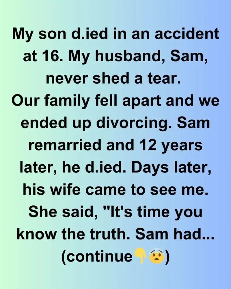My son d.ied in an accident at 16. My husband, Sam, never shed a tear. Our family fell apart and we ended up divorcing. Sam remarried and 12 years later, he died. Days later, his wife came to see me.