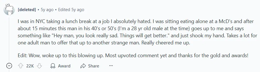 It was a short stay, but I’ll remember it forever. I owe her something. I hope I find her again one day, so I can give her money or show her what I’ve accomplished in life, to prove she didn’t help me for nothing. © Unknown author / Reddit