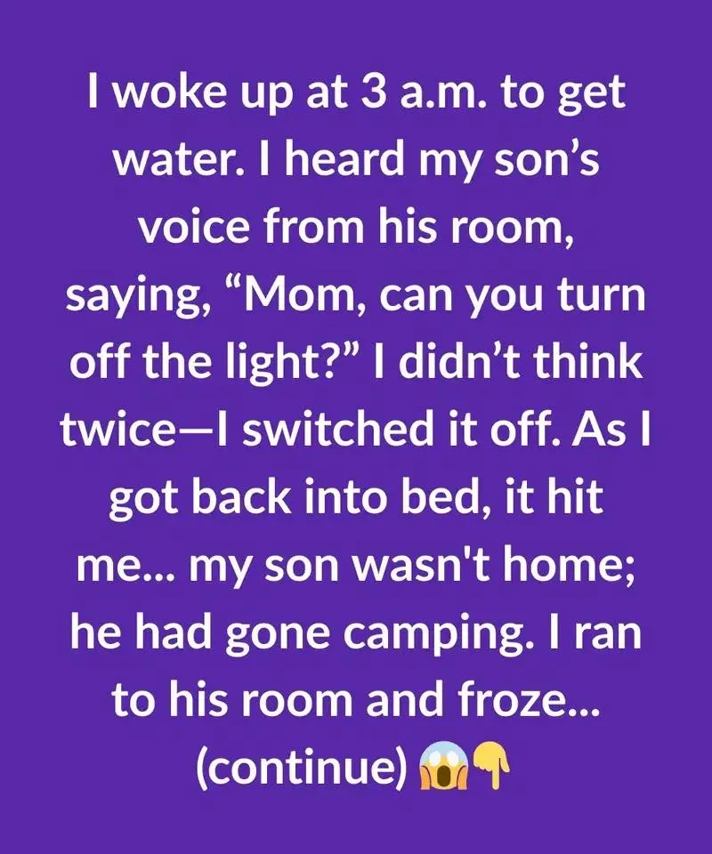 I woke up at 3 a.m. to get water. I heard my son’s voice from his room, saying, “Mom, can you turn off the light?” I didn’t think twice—I switched it off. As I got back into bed, it hit me… my son wasn’t home; he had gone camping.