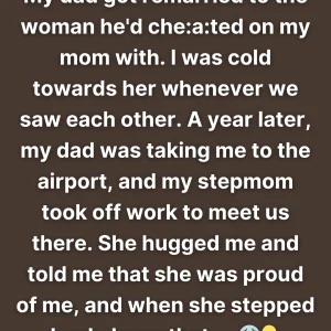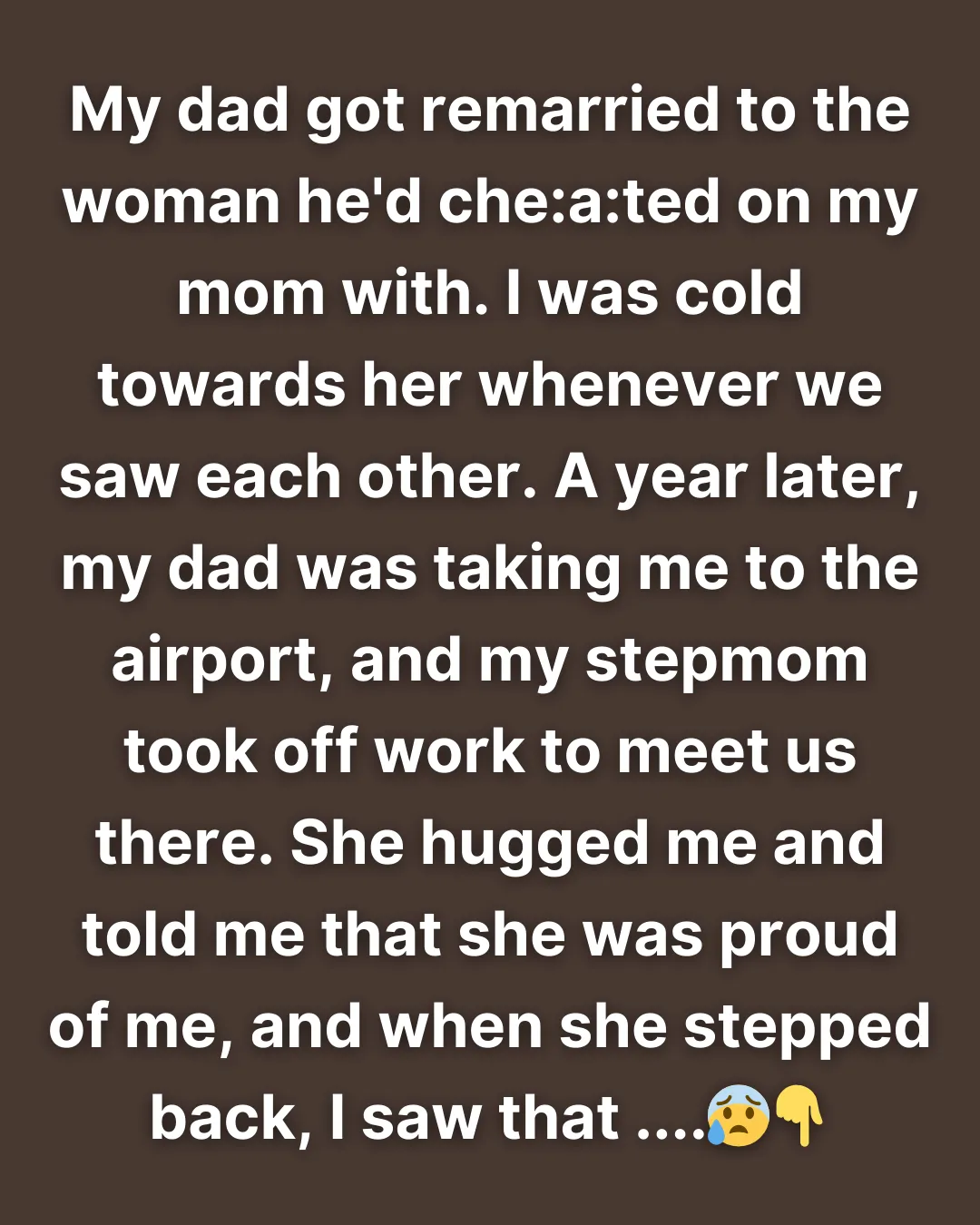 A year later, my dad was taking me to the airport on my way to college, and my stepmom took off work to meet us there and send me off with a care package. She hugged me and told me that she was proud of me, and when she stepped back, I saw that she had tears in her eyes.