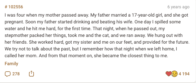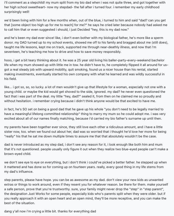 It was at that moment that I realized that she wasn’t a bad person, even if she (and my dad) had done some bad things in the past. Our relationship improved dramatically after that, and now she’s like a second mother to me. © OldSaintNickCage / Reddit