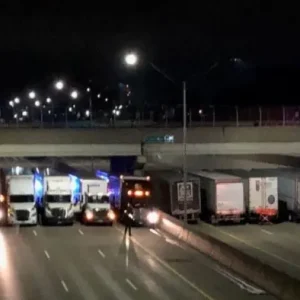 As more semi-trucks came, police closed the west-bound lanes of the highway and the truckers lined up across the east-bound lanes. After several hours, 13 big rig truck drivers stayed parked beneath the overpass until police arrived to securely transport the victim to a nearby hospital.