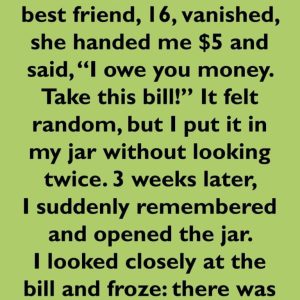 The night before my best friend, 16, vanished, she handed me $5 and said, “I owe you money. Take this bill!” It felt random, but I put it in my jar without looking twice. 3 weeks later, I suddenly remembered and opened the jar. When I examined the bill, my blood ran cold. She had marked it with a tiny handwritten message. I looked closely to read it and I froze: there was a message in blue ink that said: “No matter what happens, you will stay in my heart.”