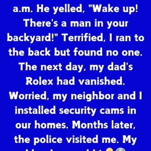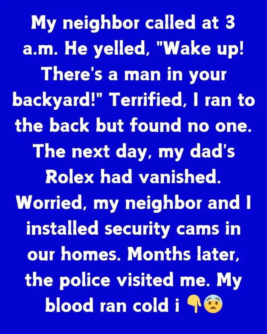 My neighbor called at 3 a.m. He yelled, “Wake up! There’s a man in your backyard!” Terrified, I ran to the back but found no one. The next day, my dad’s Rolex had vanished. Worried, my neighbor and I installed security cams in our homes.