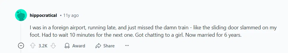 I was in a foreign airport, running late, and just missed the damn train — like the sliding door slammed on my foot. Had to wait 10 minutes for the next one. Got chatting to a girl. Now married for 6 years. © hippocratical / Reddit
