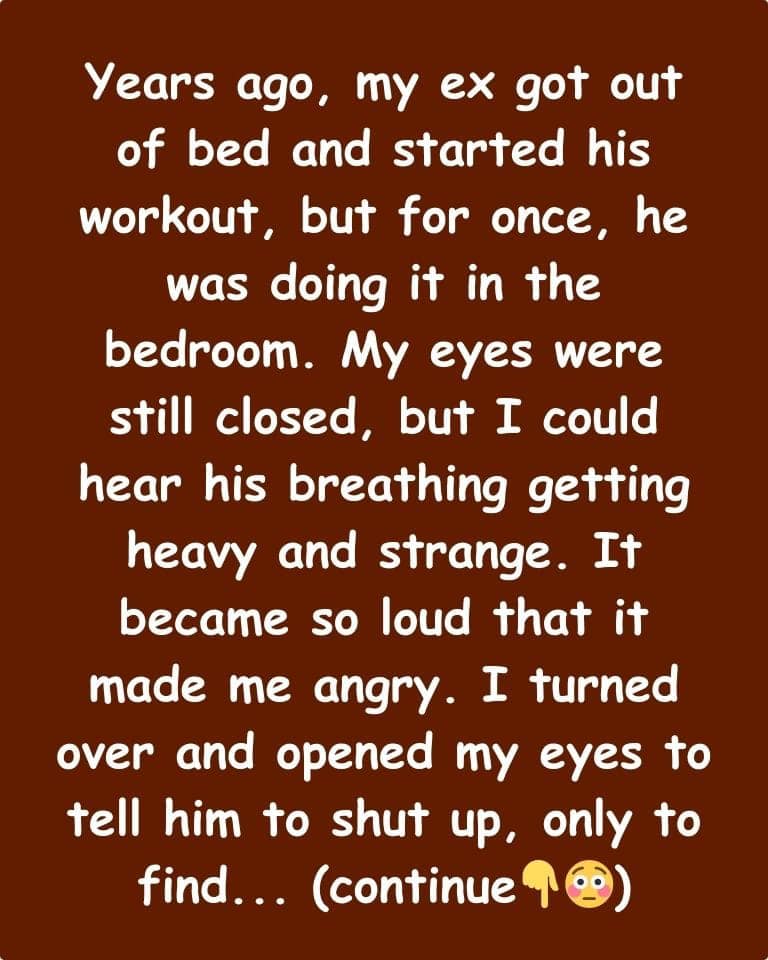Years ago, my ex-boyfriend got out of bed and started his morning workout, but for once, he was doing it in the bedroom. My eyes were still closed, but I could hear his breathing getting heavy and strange. It became so loud that it made me angry. I turned over and opened my eyes to tell him to shut up, only to find nobody in the room.