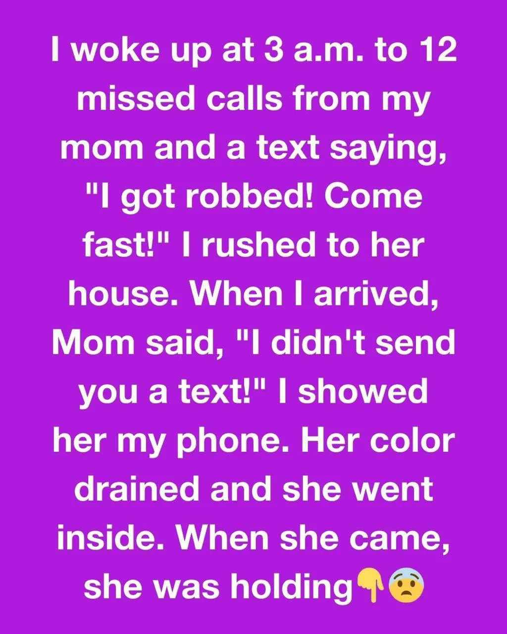 “I didn’t send you a text,” Mom said when I got there. I held up my phone to her. She went inside as her color abruptly faded. She had her phone in her hand when she returned. She displayed an unsent text message to my phone number.