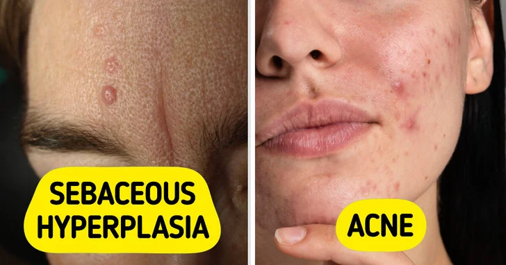 Sebaceous hyperplasia may resemble acne but is actually the result of enlarged oil glands. These glands produce sebum, which helps keep the skin moisturized.