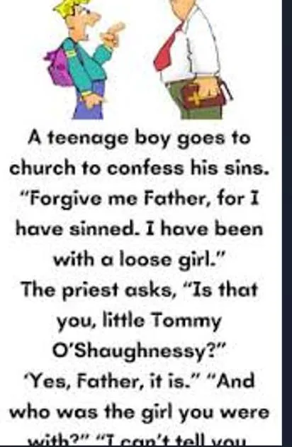 “Forgive me, Father; I have sinned. “I’ve been with a loose girl.” The priest inquires, “Is that you, little Tommy O’Shaughnessy?” “Yes, Father. It is.” “And who was the girl you were with?” “I cannot tell you, Father. I don’t want to damage her reputation.”