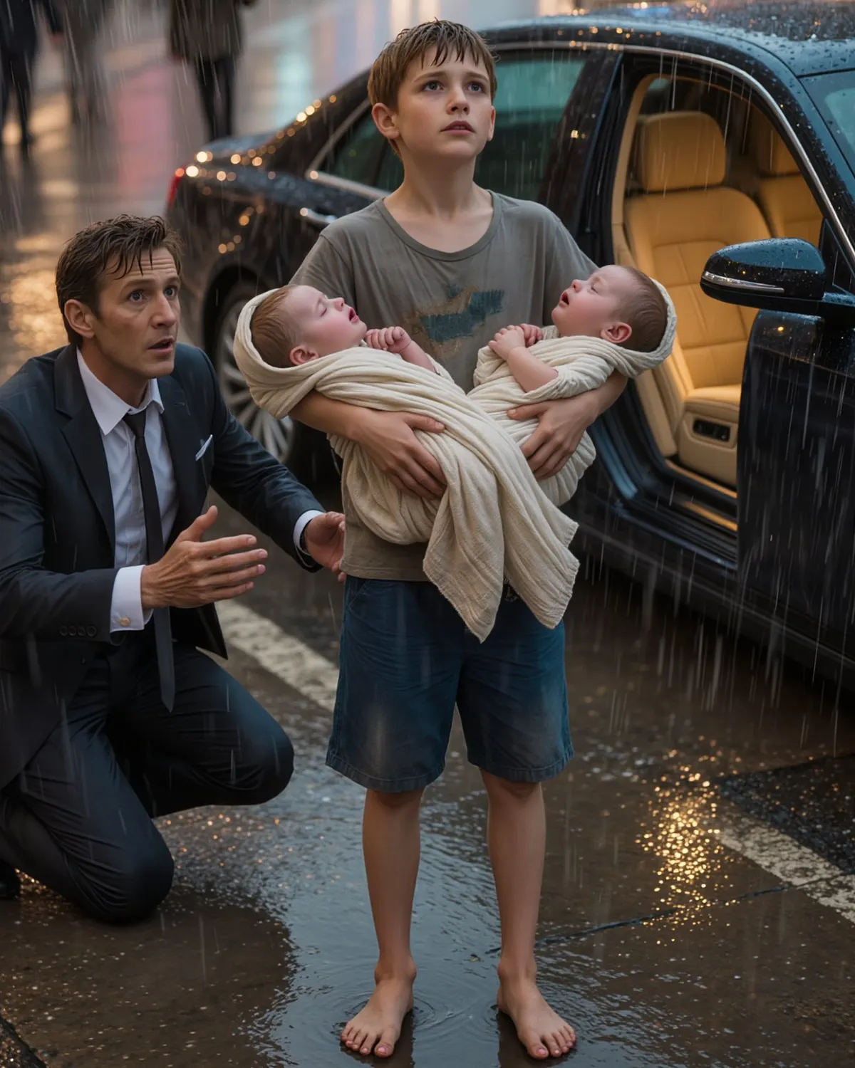 Adrian felt an unusual pull. Lowering the window, the roar of the storm filled the car. That’s when he realized: the bundle in the boy’s arms wasn’t just “something.” It was two tiny babies, wrapped in thin blankets, their weak cries nearly swallowed by the rain.