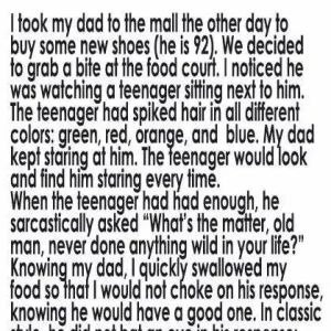 I took my dad to the mall the other day to buy some new shoes (he is 92). We decided to grab a bite at the food court. I noticed he was watching a teenager sitting next to him. The teenager had spiked hair in all different colors: green, red, orange, and blue. My dad kept staring at him. The teenager would look and find him staring every time.
