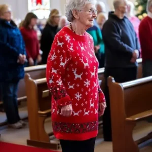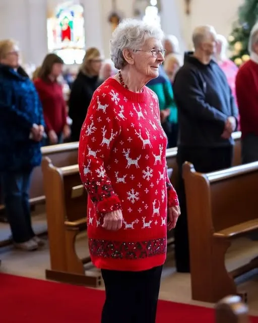 Her attire consisted of a long, vivid red Christmas sweater that exuded a sense of joy. Not just any red, either, but a striking, unrepentant crimson, adorned with baubles, snowflakes, and reindeer motifs. Her ensemble gained an almost theatrical flair as glittering details glinted in the gentle glow of the church lights.