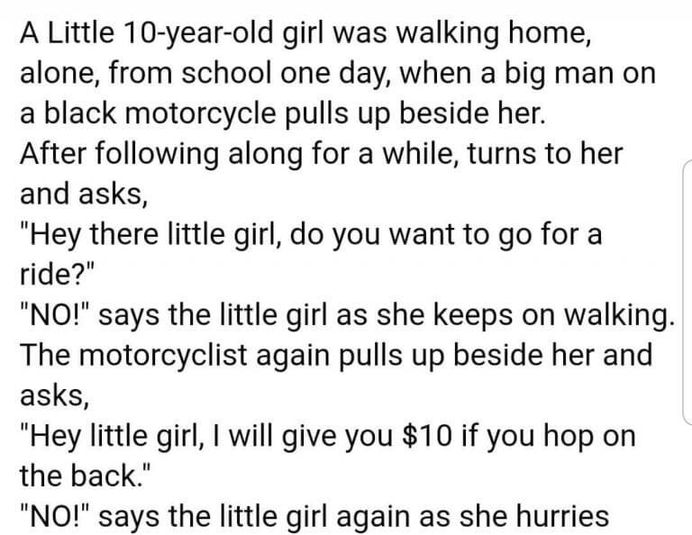 A Little 10-year-old girl was walking home, alone, from school one day, when a big man on a black motorcycle pulls up beside her. After following along for a while, turns to her and asks, “Hey there little girl, do you want to go for a ride? “NO!” says the little girl as she keeps on walking.