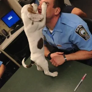 The puppy responded by jumping onto the table and smacking his paws over the officer’s face, earning a round of laughter from the other cops.