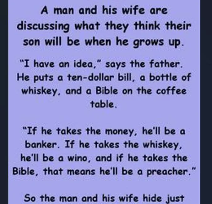 “And if he takes the Bible, that means he’ll be a preacher.” So the guy and his wife hide just before their son walks in the door and keep an eye on him from their hiding place.The boy walks over to the coffee table. He takes the ten-dollar bill, looks at it, and then sets it down.