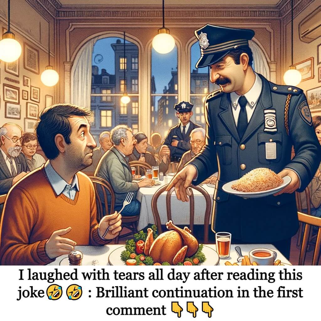 The problem is, this is the last chicken in the house. I’m afraid I’ll have to take this dish to him and arrange for another dish for you! ”The guy gets really upset and refuses to give up his food. The waiter walks over to the other table and explains the situation to the officer.