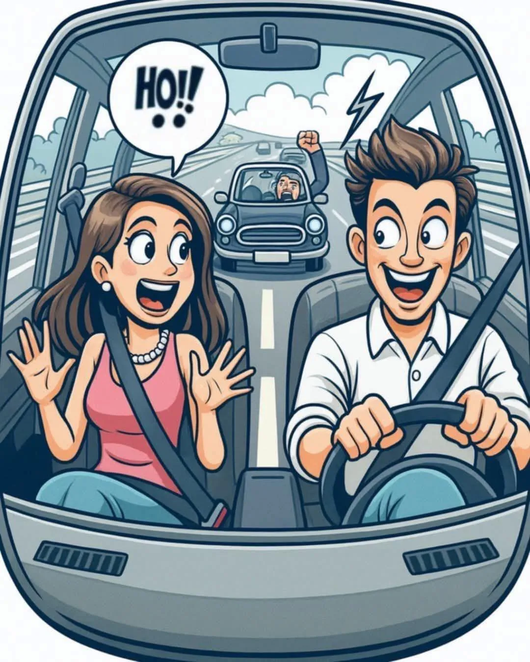 Again the husband stays quiet but grips the steering wheel more tightly and slowly increases the speed to 55mph.