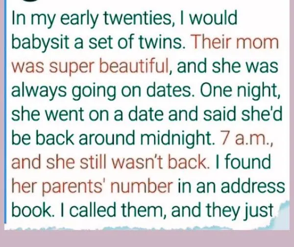 I keep calling her, and eventually, her phone goes to voice mail. I woke up at 7 a.m., and she still hasn’t returned. I finally found the grandparents’ phone number in an address book. I phoned her parents, and they didn’t seem bothered. They just look annoyed as if this is business as usual, but they say they’ll come over to sit with the twins so I can leave.