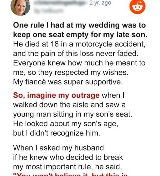 Woman Leaves Empty Seat for Late Son at Her Wedding, Sees Unfamiliar Man Occupy It