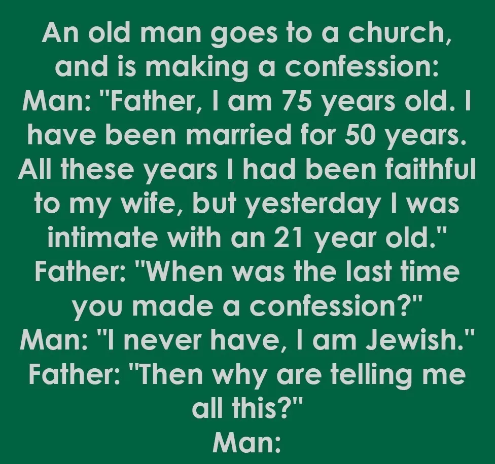 Man: “Father, I am 75 years old. I have been married for 50 years. All these years I had been faithful to my wife, but yesterday I was intimate with an 21 year old.”