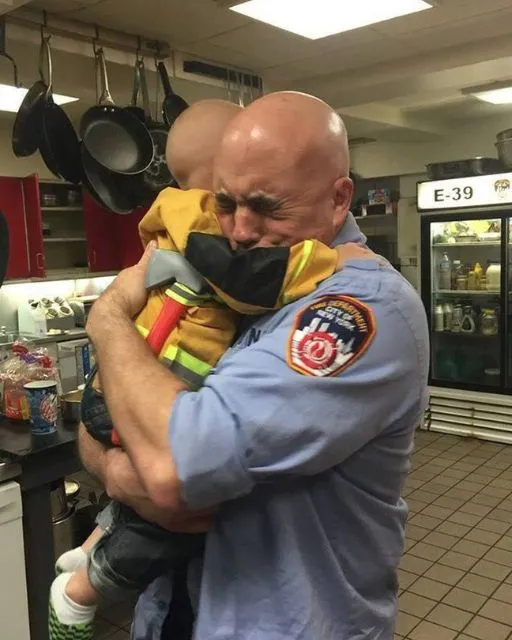 The firefighter wiped his face and crouched to Micah’s level. His voice cracked when he asked, “Who’s your daddy, buddy?”