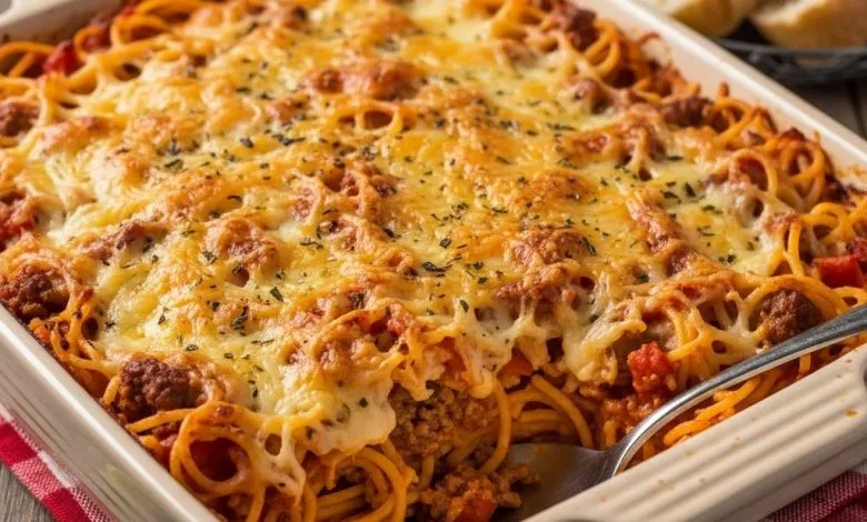 Enjoy this cheesy, savory baked spaghetti!