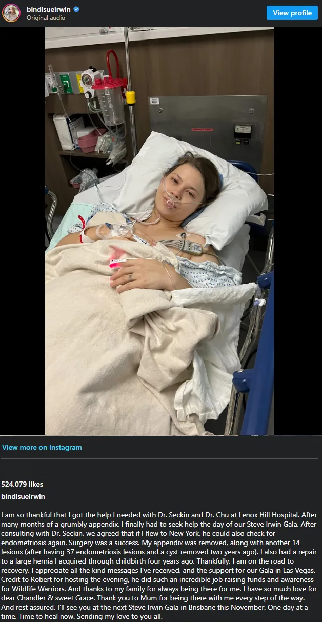 While her appendix was being removed, doctors reportedly discovered another 14 lesions from endometriosis, a condition Bindi is known to suffer from. Those were also successfully removed, and a hernia that had developed after giving birth to her daughter, Grace, in 2021 was repaired.
