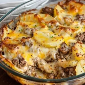 This Cheesy Hamburger Potato Casserole is the ultimate in comforting, easy-to-make dinners. Layers of tender sliced potatoes, savory seasoned ground beef and onions, and an abundance of gooey melted cheddar cheese are bound together with a creamy cheese sauce, creating a satisfying and incredibly delicious one-dish meal that’s sure to become a regular in your rotation.