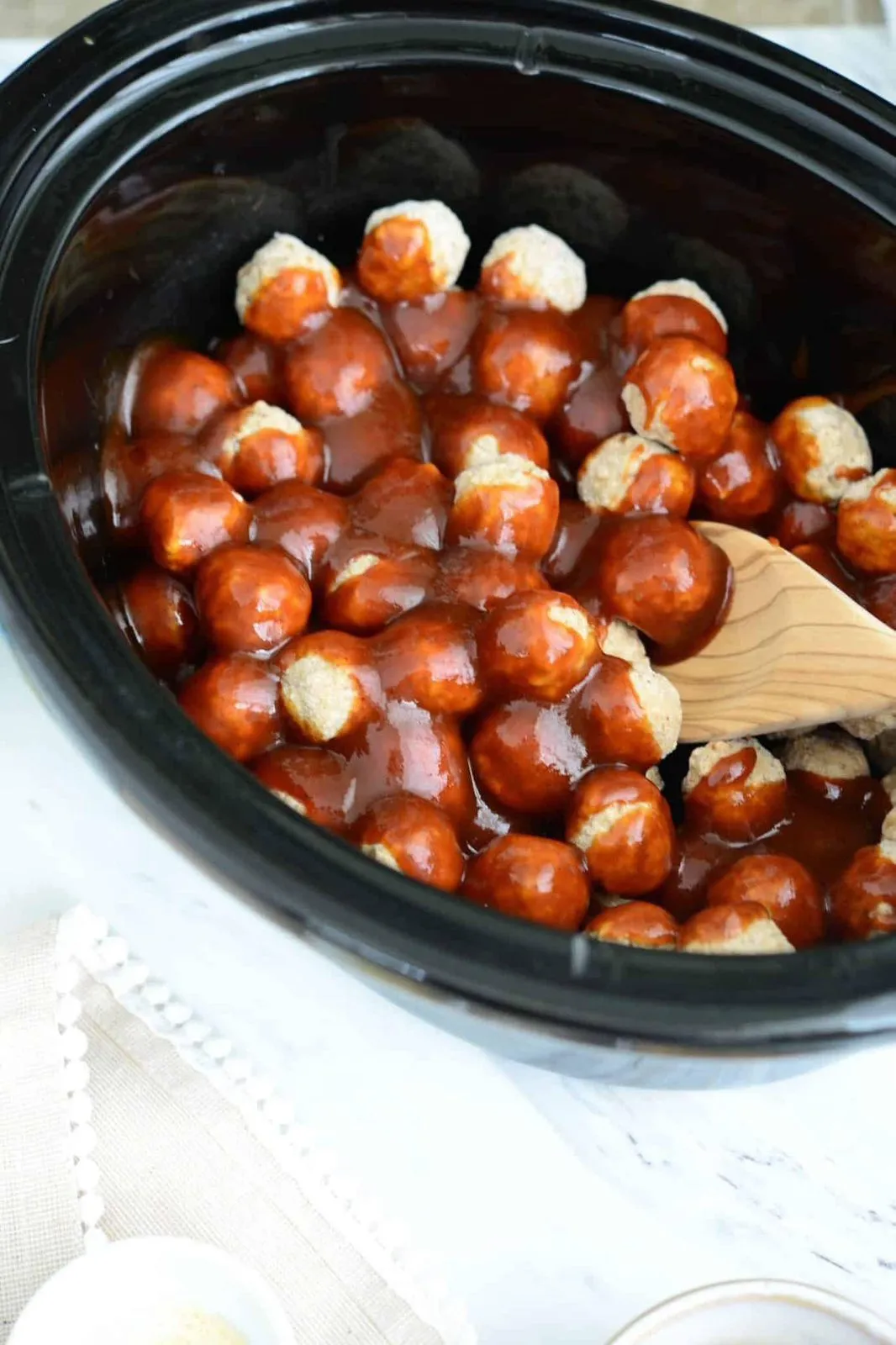 Place the frozen meatballs into the crockpot. If you’re using homemade meatballs, ensure they are fully cooked before adding them to the crockpot.