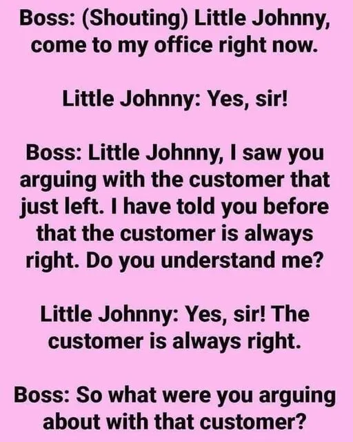 The boss, still bristling, leaned forward across his desk. “Johnny, I noticed you arguing with that customer who just left. I’ve told you before, and I’ll tell you again—the customer is always right. Do you understand that?”