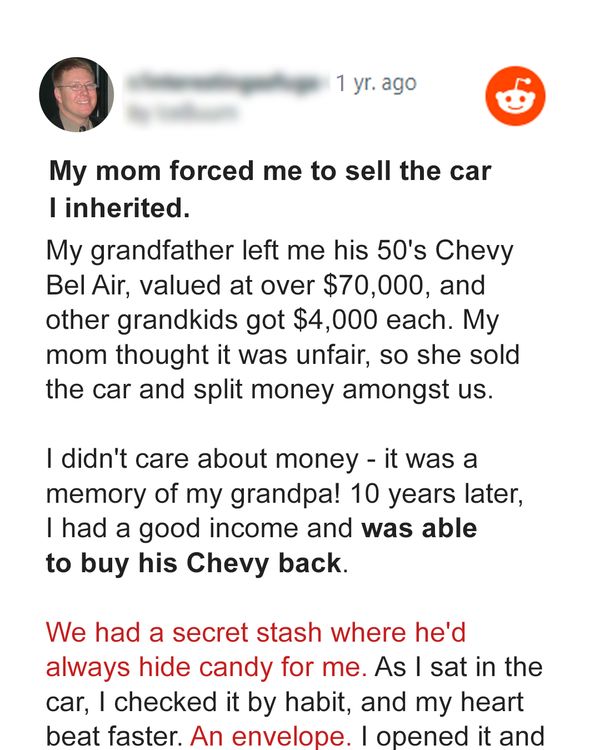 From that moment on, my relationship with my mother became strained. My sisters harbored jealousy towards me for receiving the cherished Chevy, while they were left with a mere fraction of the inheritance.