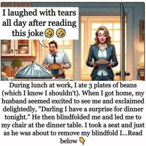 During lunch at work, I made the unfortunate decision to eat three plates of beans. When I got home, my husband greeted me with excitement and said, “Darling, I have a surprise for dinner tonight.” He blindfolded me and led me to my chair at the dinner table. Just as he was about to remove the blindfold, the telephone rang. He asked me not to peek and left to answer the call.