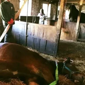 Knowing immediately that something was wrong, he put his head over the stable divider, and began to nip at Beatrice’s neck, grabbing her head and trying to pull her up.