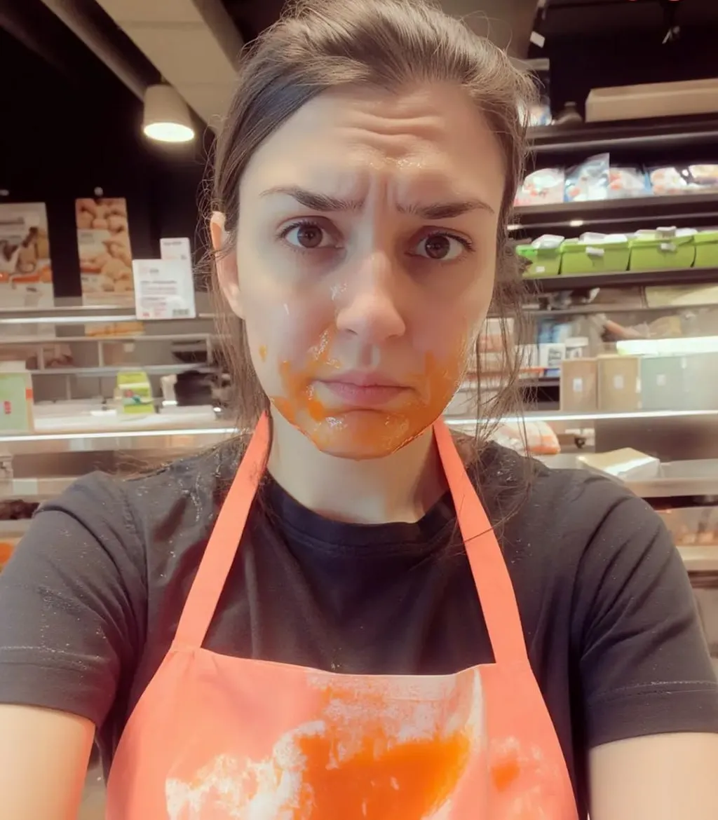 From my hiding spot, I watched as she gave up waiting and stormed out of the store, clutching her dripping bag close to her chest, leaving a trail of carrot juice in her wake.