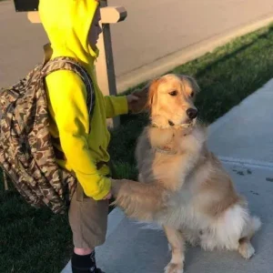 Leo in his dinosaur hoodie, gulping down cereal like we were late (we weren’t), and Max—our golden retriever—right under his chair, tail wagging, waiting for spills that never came. Since we moved here last spring, Max had this weird habit of walking Leo to the bus stop. Not just walking, though. Stopping him. Every single time, he’d sit beside him, place one paw on Leo’s knee, and stare like he was trying to say something.