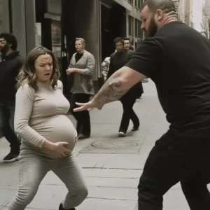 A pregnant woman stood alone on the sidewalk, her thin coat barely shielding her from the cold. One hand cradled her belly, the other hung by her side.
