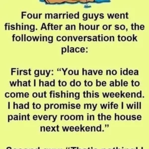 Four married guys go fishing……. After an hour, the following conversation took place: First guy: “You have no idea what I had to do to be able to come out fishing this weekend. I had to promise my wife that I will paint every room in the house next weekend.” , Second guy: “That’s nothing, I had to promise my wife that I will build her a new deck for the pool.” Third guy: “Man, you both have it easy!