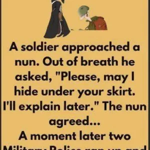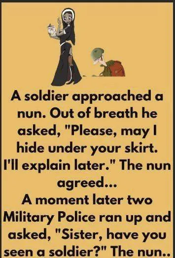 A weary soldier, out of breath, approached a kind nun. “Please,” he pleaded, “may I hide under your skirt? I’ll explain everything afterward.” The nun, with a compassionate heart, agreed.