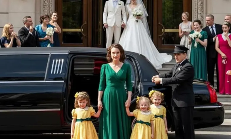 Then the moment came. A sleek black limousine rolled to a stop at the entrance. The door opened, and Emma stepped out in a gown of her own design, elegant and flawless, her hair styled, her presence commanding. The crowd gasped. She wasn’t alone. Three identical girls, radiant in matching dresses, followed her out, holding her hands.