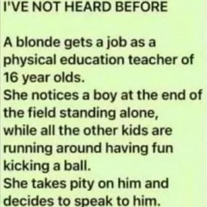 A YOUNG BLONDE LANDED A JOB AS A PHYSICAL EDUCATION TEACHER FOR A GROUP OF 16-YEAR-OLDS. AS SHE SUPERVISED THE STUDENTS PLAYING SOCCER ON THE FIELD, SHE NOTICED ONE BOY STANDING ALONE AT THE FAR END, AWAY FROM THE GROUP.FEELING SYMPATHY FOR THE BOY, SHE APPROACHED HIM. “HEY THERE, EVERYTHING ALRIGHT?” SHE ASKED KINDLY. THE BOY NODDED. SENSING HIS RELUCTANCE TO JOIN THE GAME, SHE ENCOURAGED HIM, SAYING, “YOU CAN GO AND HAVE FUN WITH THE OTHERS, YOU KNOW.”CONTINUE READING BELOW TO SEE WHAT HAPPENED…TO HER SURPRISE, THE BOY SHOOK HIS HEAD. “I THINK IT’S BEST IF I STAY HERE,” HE REPLIED. THE TEACHER INQUIRED FURTHER, “AND WHY IS THAT, HONEY?” THE BOY LOOKED AT HER CONFUSED AND SAID, “BECAUSE I’M THE GOALIE!”