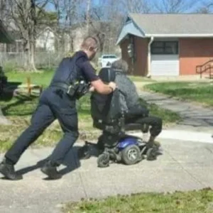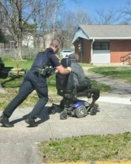 The officer looked around—no way to charge it, no easy fix. So, without hesitation, he placed both hands on the wheelchair and started pushing.