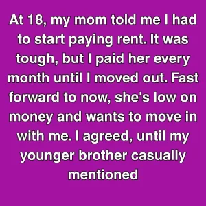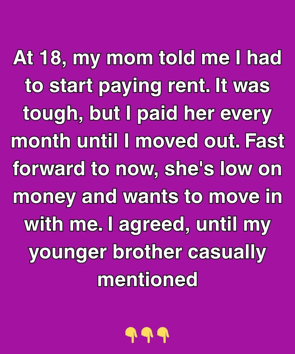 At 18, my mom told me I had to start paying rent. It was tough, but I paid her every month until I moved out. Fast forward to now, she’s low on money and wants to move in with me. I agreed, until my younger brother casually mentioned that Mom never charged him a dime, even when he turned 25. That revelation landed like a punch in the gut.