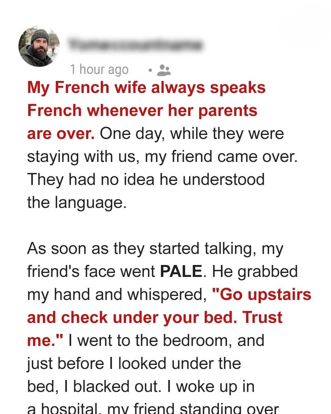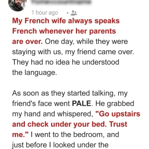 My French wife always speaks French whenever her parents are over. One day, while they were staying with us, my friend came over. They had no idea he knew the language. As soon as they started talking, my friend’s face went PALE. He grabbed my hand and whispered, “Go upstairs and check under your bed. Trust me.” I went to the bedroom, and just before I looked under the bed, I blacked out. I woke in a hospital, my friend standing over…