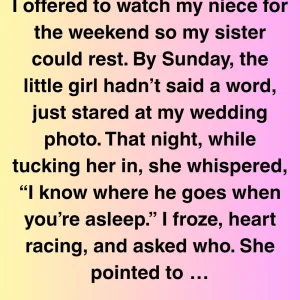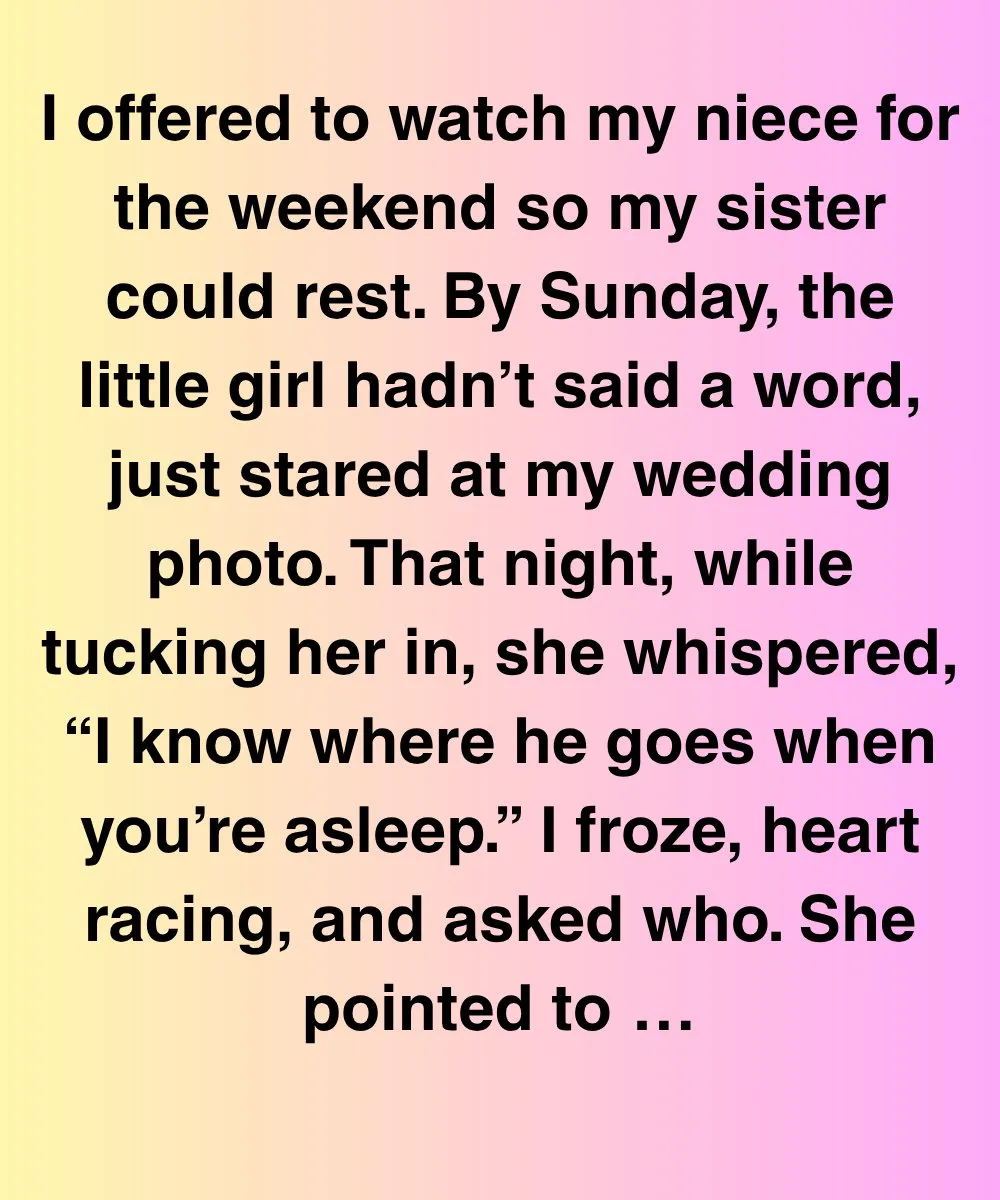 I offered to watch my niece for the weekend so my sister could rest. By Sunday, the little girl hadn’t said a word, just stared at my wedding photo. That night, while tucking her in, she whispered, “I know where he goes when you’re asleep.” I froze, heart racing, and asked who. She pointed to my husband.