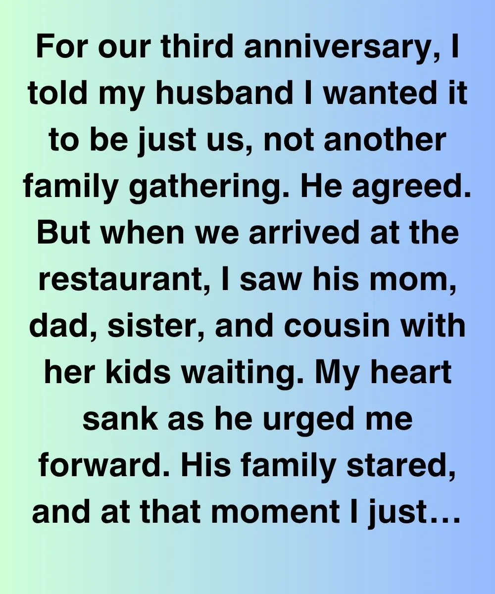 For our third anniversary, I told my husband I wanted it to be just us, not another family gathering. He agreed. But when we arrived at the restaurant, I saw his mom, dad, sister, and cousin with her kids waiting. My heart sank as he urged me forward. His family stared, and at that moment I just froze. I felt like an ornament being placed where it was supposed to go, not a wife being cherished. As we sat down, his mother waved me over to a seat right next to her. She started telling me how proud she was of her son and how she always knew he’d marry someone who “fit right into their family traditions.”