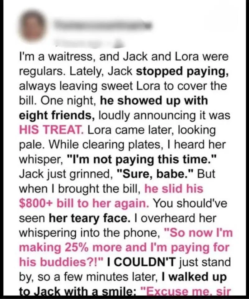 I’m a waitress, and Jack and Lora were regulars. Lately, Jack stopped paying, always leaving sweet Lora to cover the bill. One night, he showed up with eight friends, loudly announcing it was HIS TREAT. Lora came later, looking pale. While clearing plates, I heard her whisper, ‘I’m not paying this time.’ Jack just grinned, ‘Sure, babe.’ But when I brought the bill, he slid his $800+ bill to her again. You should’ve seen her teary face. I overheard her whispering into the phone, ‘So now I’m making 25% more and I’m paying for his buddies?!’ I COULDN’T just stand by, so a few minutes later, I walked up to Jack with a smile: ‘Excuse me, sir…’”