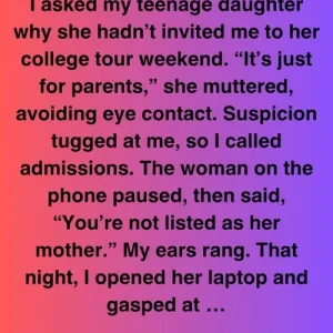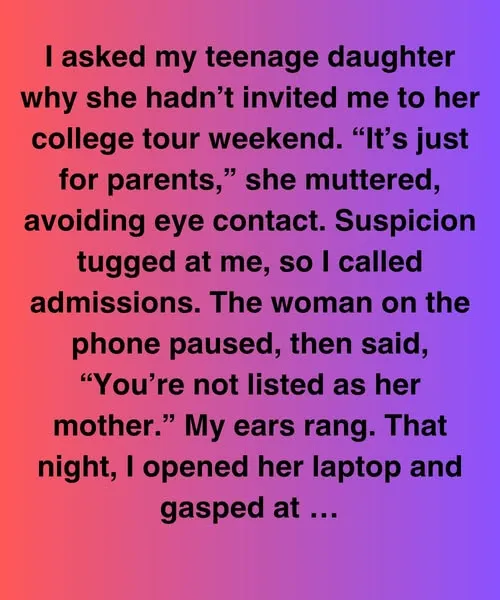 I asked my teenage daughter why she hadn’t invited me to her college tour weekend. “It’s just for parents,” she muttered, avoiding eye contact. Suspicion tugged at me, so I called admissions. The woman on the phone paused, then said, “You’re not listed as her mother.” My ears rang. That night, I opened her laptop and gasped at what I saw.