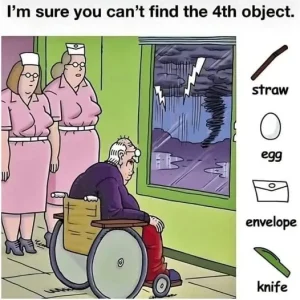 The purpose of this puzzle is to deceive your eyes. The setting seems straightforward at first glance: two nurses, a man in a wheelchair, and a stormy landscape outside the window. But the details are where the difficulty resides. Is it possible to locate all four of the objects concealed in the image?