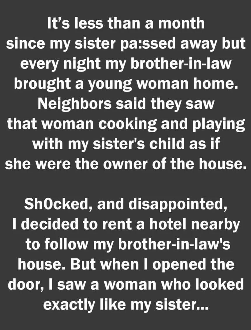 It wasn’t my sister. It wasn’t a strange woman either. It was my brother-in-law’s face.
